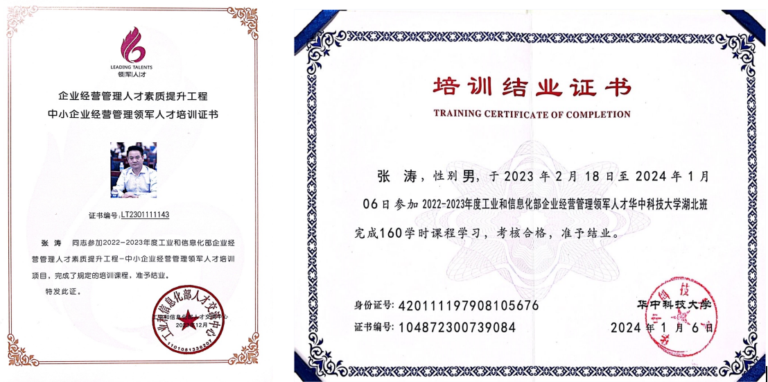 我司董事長(zhǎng)兼總經(jīng)理張濤參加了2022~2023年度為期一年中小企業(yè)經(jīng)營(yíng)管理領(lǐng)軍人才華中科技大學(xué)湖北班的培訓(xùn)學(xué)習(xí),并經(jīng)考核合格順利結(jié)業(yè)。