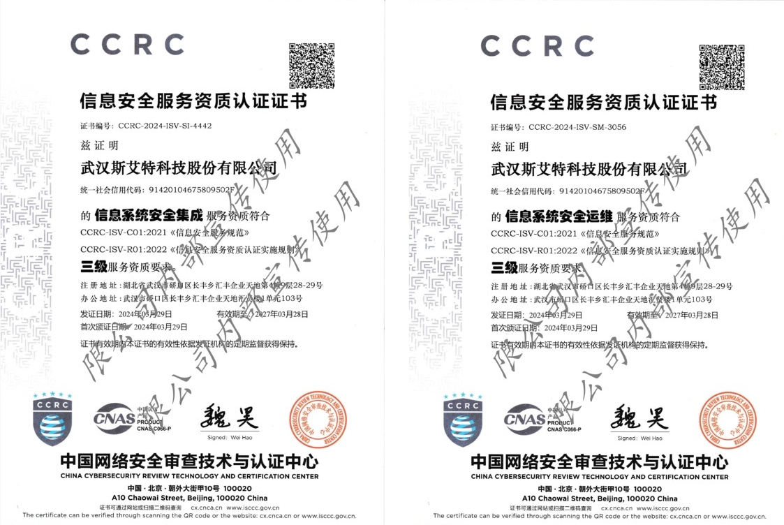 2024年3月,武漢斯艾特科技股份有限公司順利通過(guò)中國(guó)網(wǎng)絡(luò)安全審查技術(shù)與認(rèn)證中心(CCRC)的嚴(yán)格審核,4月成功獲得信息系統(tǒng)安全集成服務(wù)和信息系統(tǒng)安全運(yùn)維服務(wù)兩個(gè)方向的資質(zhì)認(rèn)證證書(shū)。